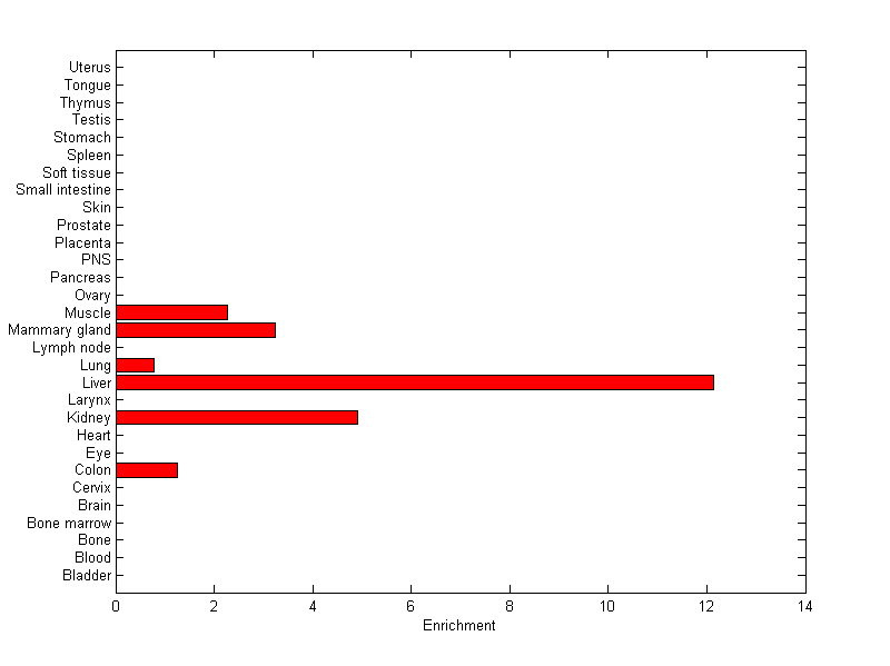 The expression level is normalized with tissue-library size. Each value for a gene in a tissue is a ratio of observed ESTs to the expected one in this tissue. The expected number of ESTs is the product of total ESTs of the gene and the fraction of total ESTs in the tissue among all ESTs in 30 tissues.