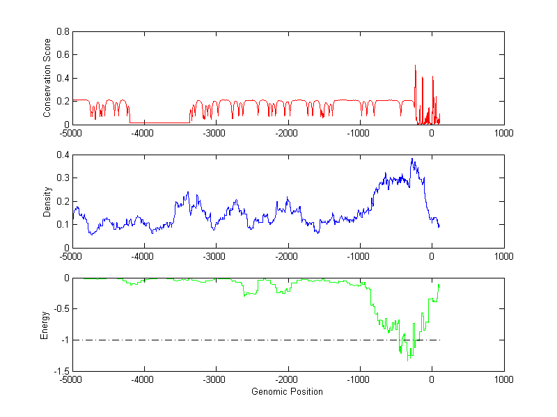 The energy profile (green curve) is about energy for module detection based on TF interaction. The positions with energy less than -1 indicate the existence of CRMs.