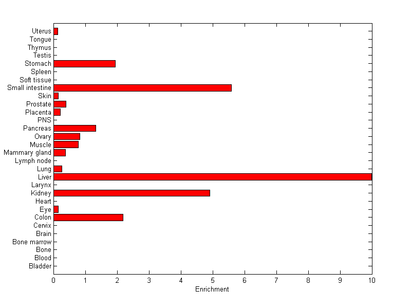 The expression level is normalized with tissue-library size. Each value for a gene in a tissue is a ratio of observed ESTs to the expected one in this tissue. The expected number of ESTs is the product of total ESTs of the gene and the fraction of total ESTs in the tissue among all ESTs in 30 tissues.
