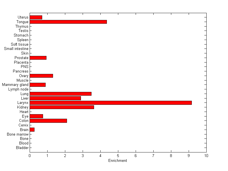 The expression level is normalized with tissue-library size. Each value for a gene in a tissue is a ratio of observed ESTs to the expected one in this tissue. The expected number of ESTs is the product of total ESTs of the gene and the fraction of total ESTs in the tissue among all ESTs in 30 tissues.