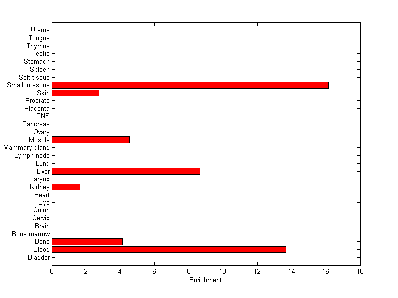 The expression level is normalized with tissue-library size. Each value for a gene in a tissue is a ratio of observed ESTs to the expected one in this tissue. The expected number of ESTs is the product of total ESTs of the gene and the fraction of total ESTs in the tissue among all ESTs in 30 tissues.