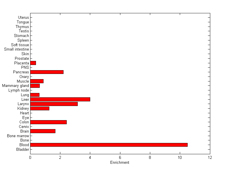 The expression level is normalized with tissue-library size. Each value for a gene in a tissue is a ratio of observed ESTs to the expected one in this tissue. The expected number of ESTs is the product of total ESTs of the gene and the fraction of total ESTs in the tissue among all ESTs in 30 tissues.