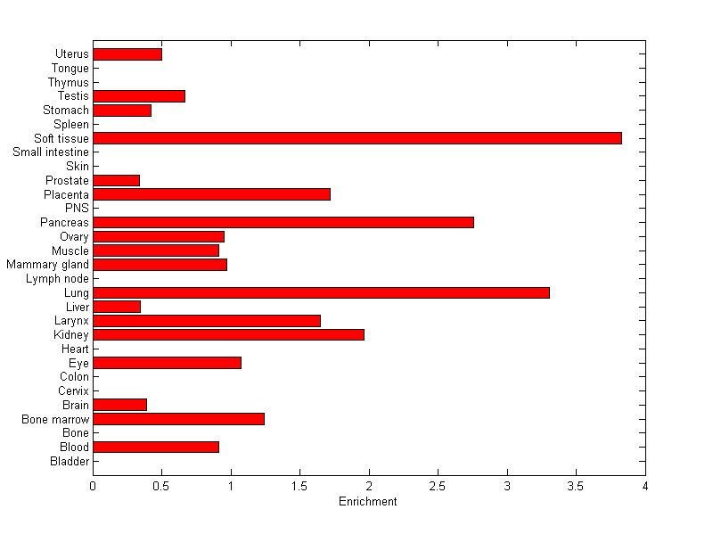The expression level is normalized with tissue-library size. Each value for a gene in a tissue is a ratio of observed ESTs to the expected one in this tissue. The expected number of ESTs is the product of total ESTs of the gene and the fraction of total ESTs in the tissue among all ESTs in 30 tissues.