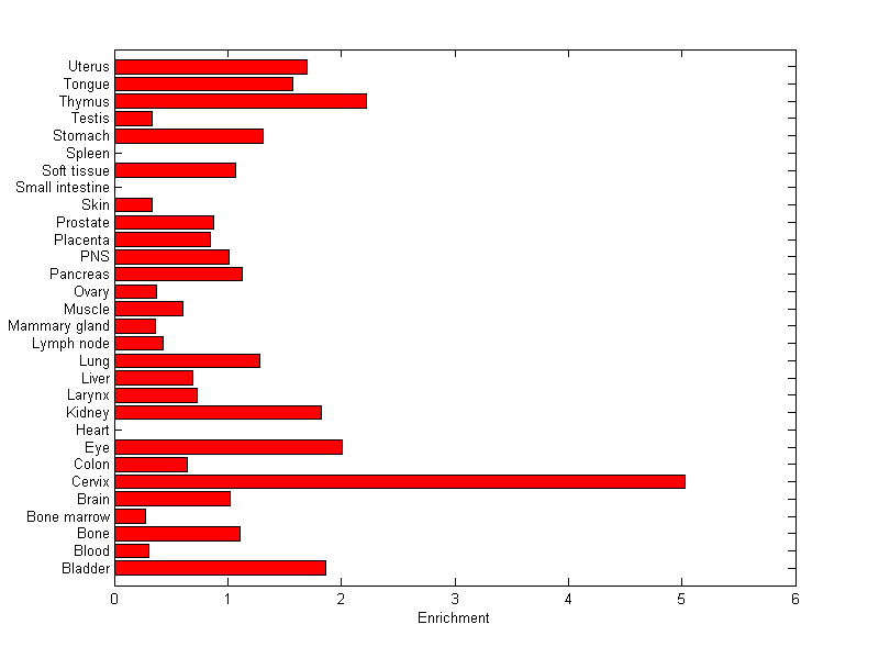 About the profile: The expression level is normalized with tissue-library size. Each value for a gene in a tissue is a ratio of observed ESTs to the expected one in this tissue. The expected number of ESTs is the product of total ESTs of the gene and the fraction of total ESTs in the tissue among all ESTs in 30 tissues. Summary: This gene is preferentially expressed in [cervix] Download: |