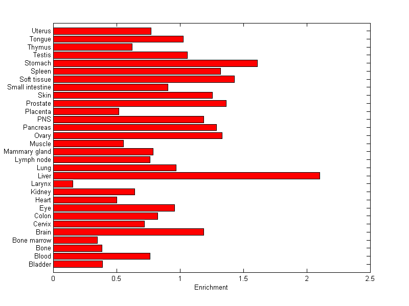 The expression level is normalized with tissue-library size. Each value for a gene in a tissue is a ratio of observed ESTs to the expected one in this tissue. The expected number of ESTs is the product of total ESTs of the gene and the fraction of total ESTs in the tissue among all ESTs in 30 tissues.