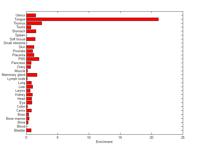 The expression level is normalized with tissue-library size. Each value for a gene in a tissue is a ratio of observed ESTs to the expected one in this tissue. The expected number of ESTs is the product of total ESTs of the gene and the fraction of total ESTs in the tissue among all ESTs in 30 tissues.