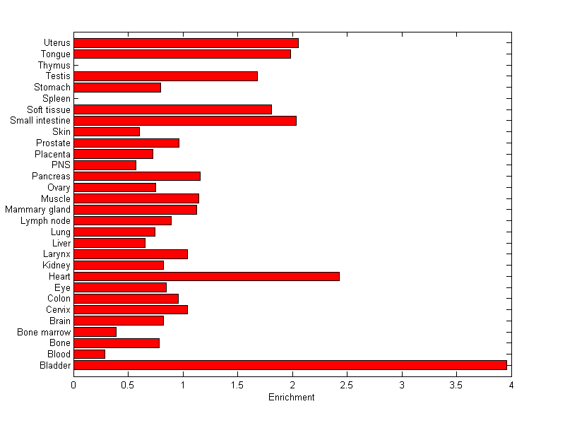 The expression level is normalized with tissue-library size. Each value for a gene in a tissue is a ratio of observed ESTs to the expected one in this tissue. The expected number of ESTs is the product of total ESTs of the gene and the fraction of total ESTs in the tissue among all ESTs in 30 tissues.
