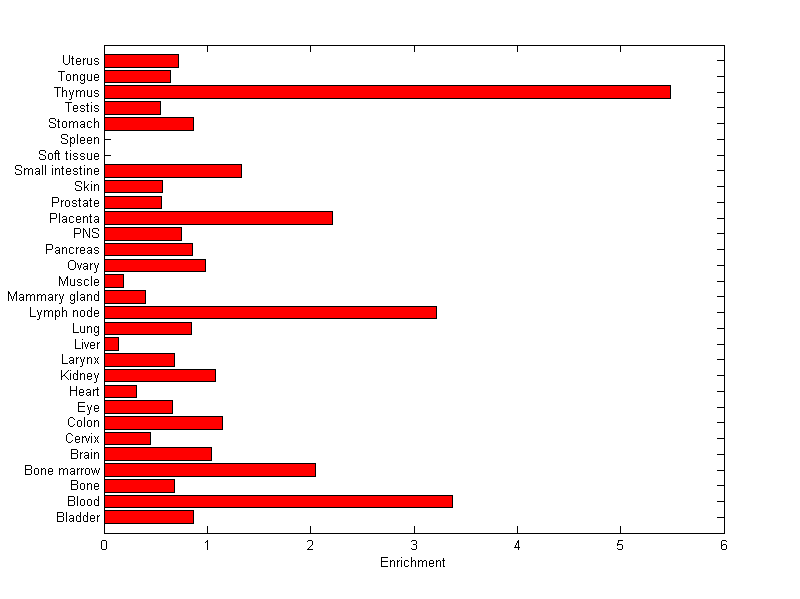 The expression level is normalized with tissue-library size. Each value for a gene in a tissue is a ratio of observed ESTs to the expected one in this tissue. The expected number of ESTs is the product of total ESTs of the gene and the fraction of total ESTs in the tissue among all ESTs in 30 tissues.