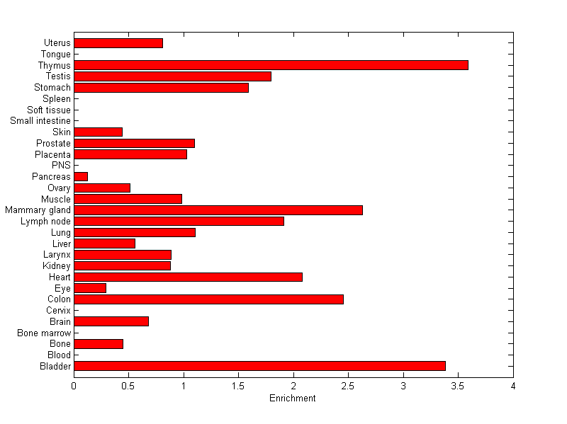 The expression level is normalized with tissue-library size. Each value for a gene in a tissue is a ratio of observed ESTs to the expected one in this tissue. The expected number of ESTs is the product of total ESTs of the gene and the fraction of total ESTs in the tissue among all ESTs in 30 tissues.
