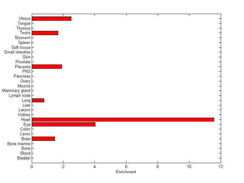 The expression level is normalized with tissue-library size. Each value for a gene in a tissue is a ratio of observed ESTs to the expected one in this tissue. The expected number of ESTs is the product of total ESTs of the gene and the fraction of total ESTs in the tissue among all ESTs in 30 tissues.