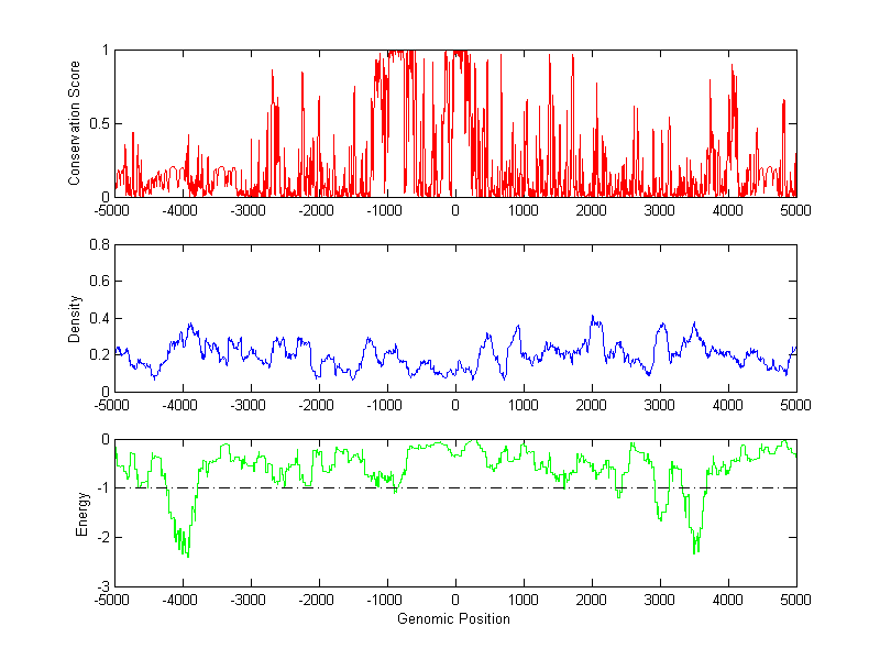 The energy profile (green curve) is about energy for module detection based on TF interaction. The positions with energy less than -1 indicate the existence of CRMs.