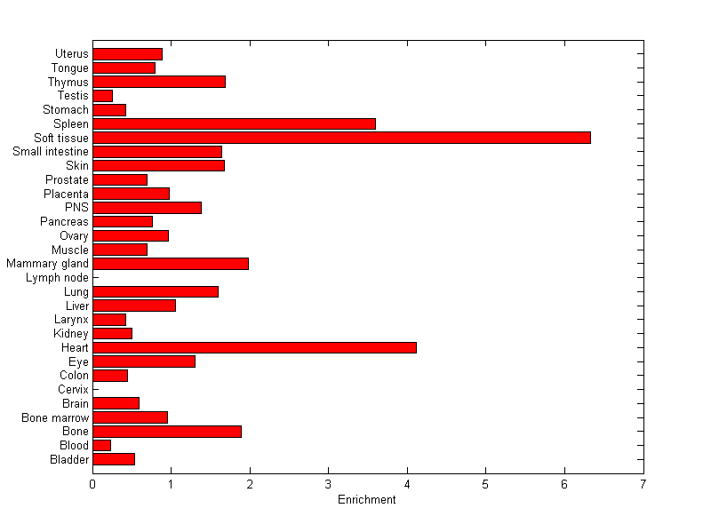 The expression level is normalized with tissue-library size. Each value for a gene in a tissue is a ratio of observed ESTs to the expected one in this tissue. The expected number of ESTs is the product of total ESTs of the gene and the fraction of total ESTs in the tissue among all ESTs in 30 tissues.