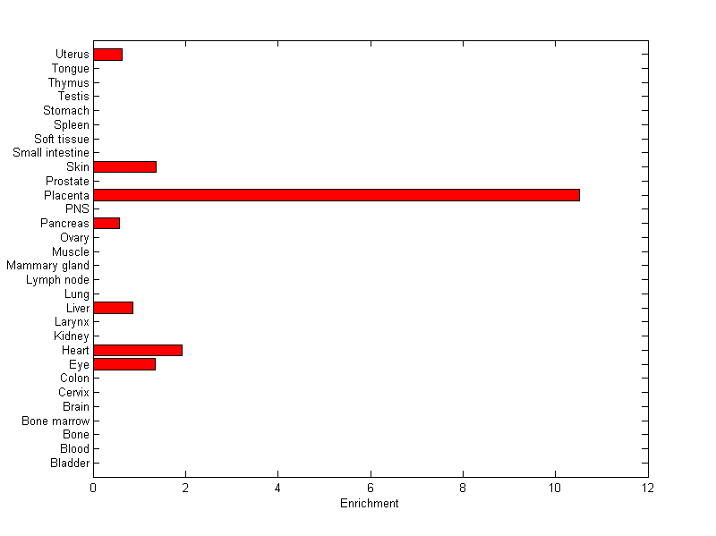About the profile: The expression level is normalized with tissue-library size. Each value for a gene in a tissue is a ratio of observed ESTs to the expected one in this tissue. The expected number of ESTs is the product of total ESTs of the gene and the fraction of total ESTs in the tissue among all ESTs in 30 tissues. Summary: This gene is preferentially expressed in [placenta] Download: |