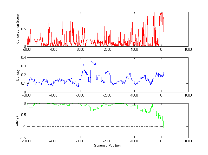 About the profiles: The conservation profile (red curve) is about conservation scores of the promoter sequences. Conservation was determined from an eight-way alignment of human, chimpanzee, dog, mouse, rat, chicken, zebrafish and fugu sequences. The conservation was quantified by a conservation score between 0 and 1, with 1 as highest conservation. The conservation score was obtained from UCSC genome databases. The density profile (blue curve) is about density of all TF binding sites. The energy profile (green curve) is about energy for module detection based on TF interaction. The positions with energy less than -1 indicate the existence of CRMs. Download: Conservation profileDensity profile Energy profile CRM summary |
