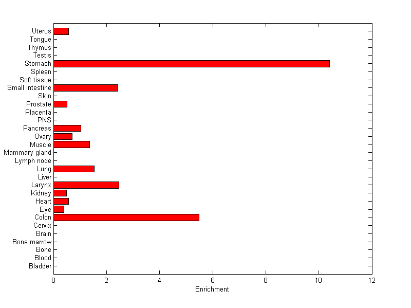 About the profile: The expression level is normalized with tissue-library size. Each value for a gene in a tissue is a ratio of observed ESTs to the expected one in this tissue. The expected number of ESTs is the product of total ESTs of the gene and the fraction of total ESTs in the tissue among all ESTs in 30 tissues. Summary: This gene is preferentially expressed in [colon, stomach] Download: |
