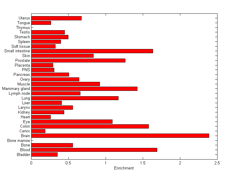 The expression level is normalized with tissue-library size. Each value for a gene in a tissue is a ratio of observed ESTs to the expected one in this tissue. The expected number of ESTs is the product of total ESTs of the gene and the fraction of total ESTs in the tissue among all ESTs in 30 tissues.