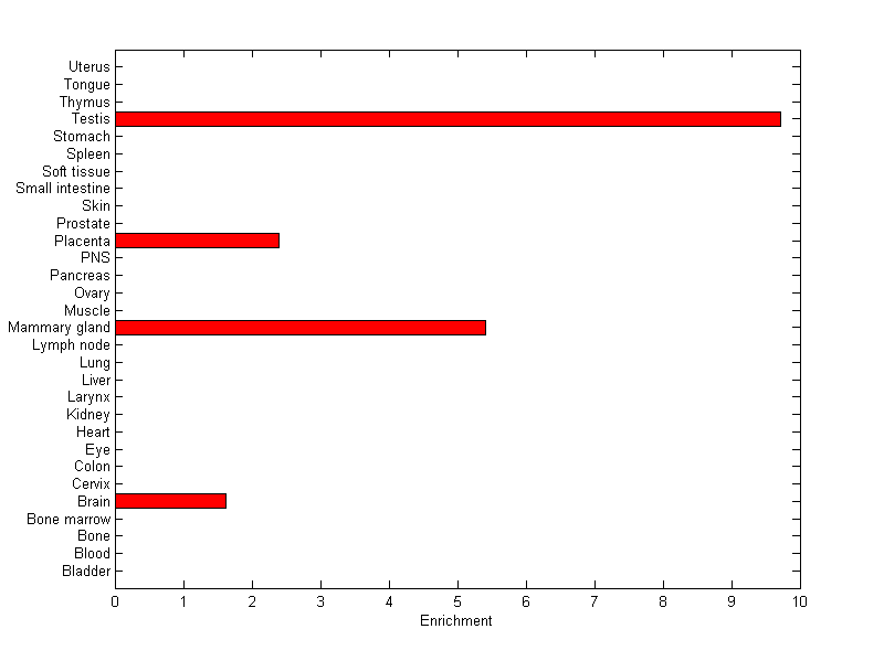 The expression level is normalized with tissue-library size. Each value for a gene in a tissue is a ratio of observed ESTs to the expected one in this tissue. The expected number of ESTs is the product of total ESTs of the gene and the fraction of total ESTs in the tissue among all ESTs in 30 tissues.