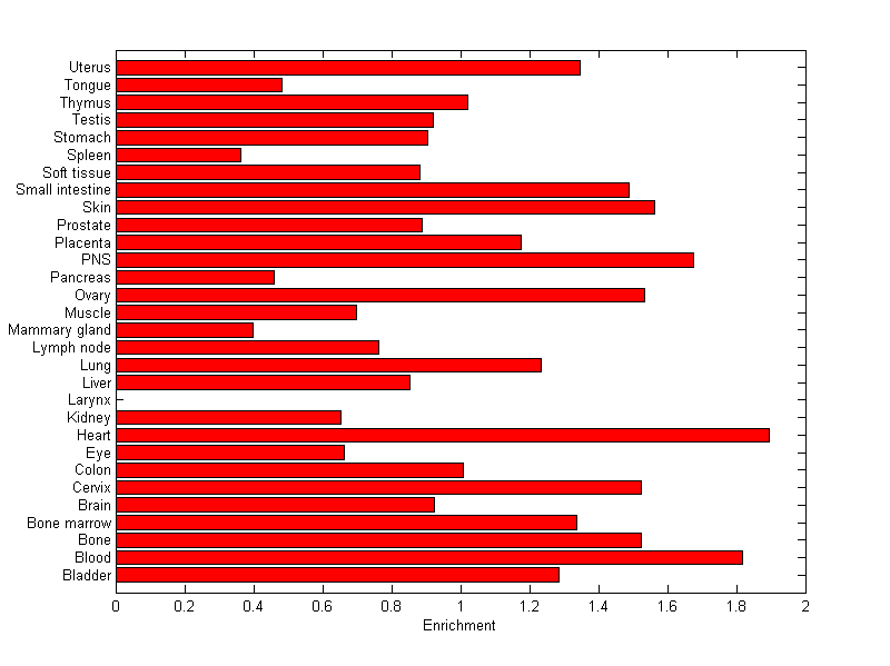 The expression level is normalized with tissue-library size. Each value for a gene in a tissue is a ratio of observed ESTs to the expected one in this tissue. The expected number of ESTs is the product of total ESTs of the gene and the fraction of total ESTs in the tissue among all ESTs in 30 tissues.