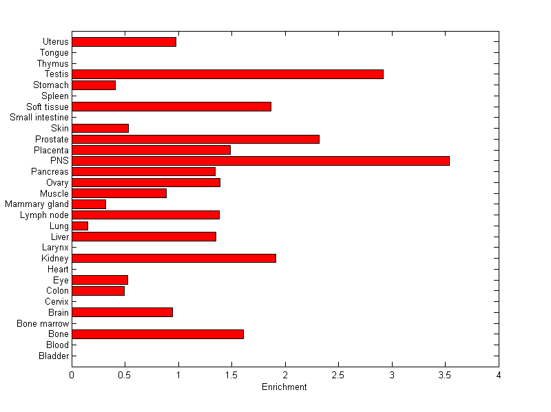 The expression level is normalized with tissue-library size. Each value for a gene in a tissue is a ratio of observed ESTs to the expected one in this tissue. The expected number of ESTs is the product of total ESTs of the gene and the fraction of total ESTs in the tissue among all ESTs in 30 tissues.
