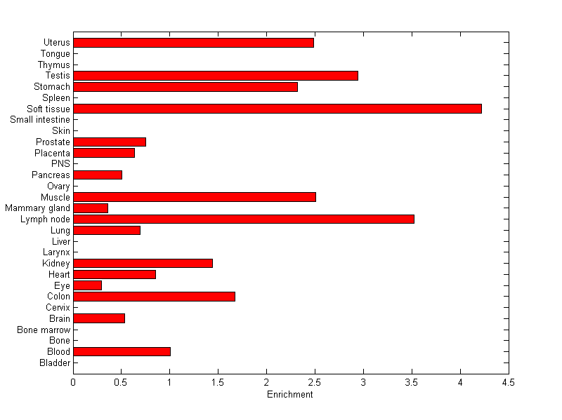 The expression level is normalized with tissue-library size. Each value for a gene in a tissue is a ratio of observed ESTs to the expected one in this tissue. The expected number of ESTs is the product of total ESTs of the gene and the fraction of total ESTs in the tissue among all ESTs in 30 tissues.