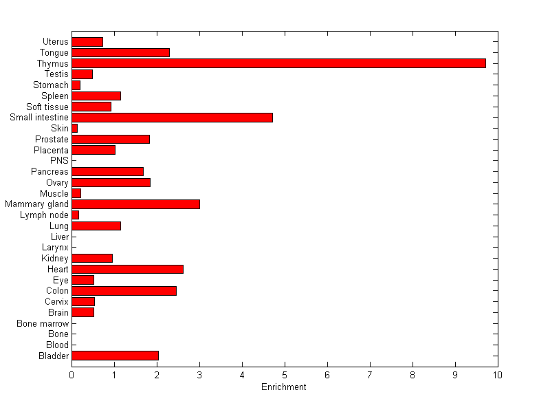The expression level is normalized with tissue-library size. Each value for a gene in a tissue is a ratio of observed ESTs to the expected one in this tissue. The expected number of ESTs is the product of total ESTs of the gene and the fraction of total ESTs in the tissue among all ESTs in 30 tissues.