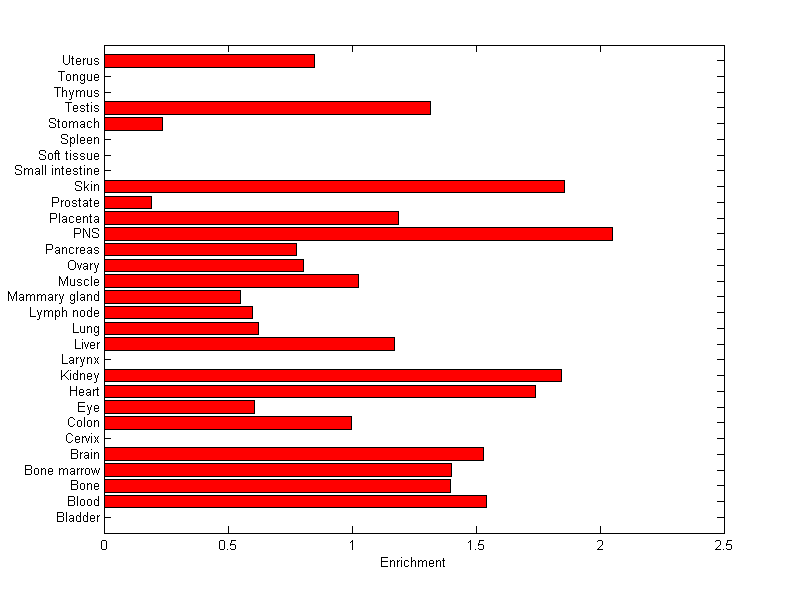 The expression level is normalized with tissue-library size. Each value for a gene in a tissue is a ratio of observed ESTs to the expected one in this tissue. The expected number of ESTs is the product of total ESTs of the gene and the fraction of total ESTs in the tissue among all ESTs in 30 tissues.