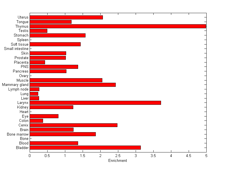 The expression level is normalized with tissue-library size. Each value for a gene in a tissue is a ratio of observed ESTs to the expected one in this tissue. The expected number of ESTs is the product of total ESTs of the gene and the fraction of total ESTs in the tissue among all ESTs in 30 tissues.