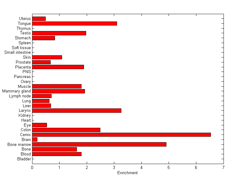 The expression level is normalized with tissue-library size. Each value for a gene in a tissue is a ratio of observed ESTs to the expected one in this tissue. The expected number of ESTs is the product of total ESTs of the gene and the fraction of total ESTs in the tissue among all ESTs in 30 tissues.