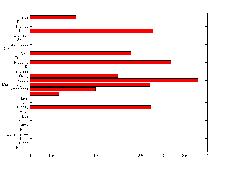 The expression level is normalized with tissue-library size. Each value for a gene in a tissue is a ratio of observed ESTs to the expected one in this tissue. The expected number of ESTs is the product of total ESTs of the gene and the fraction of total ESTs in the tissue among all ESTs in 30 tissues.
