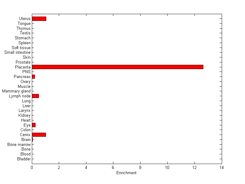 About the profile: The expression level is normalized with tissue-library size. Each value for a gene in a tissue is a ratio of observed ESTs to the expected one in this tissue. The expected number of ESTs is the product of total ESTs of the gene and the fraction of total ESTs in the tissue among all ESTs in 30 tissues. Summary: This gene is preferentially expressed in [placenta] Download: |