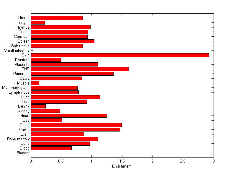 The expression level is normalized with tissue-library size. Each value for a gene in a tissue is a ratio of observed ESTs to the expected one in this tissue. The expected number of ESTs is the product of total ESTs of the gene and the fraction of total ESTs in the tissue among all ESTs in 30 tissues.
