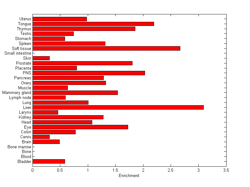 The expression level is normalized with tissue-library size. Each value for a gene in a tissue is a ratio of observed ESTs to the expected one in this tissue. The expected number of ESTs is the product of total ESTs of the gene and the fraction of total ESTs in the tissue among all ESTs in 30 tissues.
