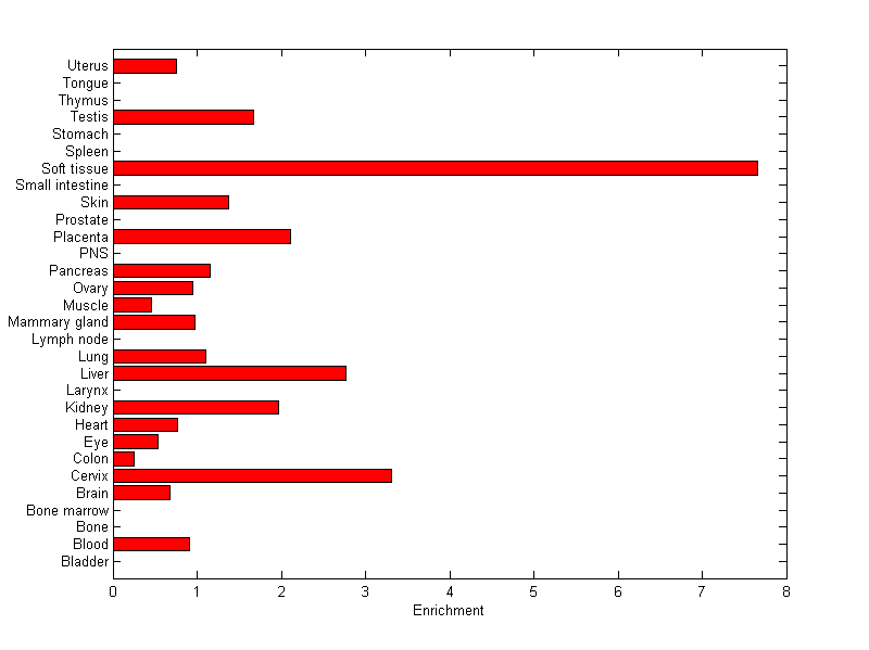 The expression level is normalized with tissue-library size. Each value for a gene in a tissue is a ratio of observed ESTs to the expected one in this tissue. The expected number of ESTs is the product of total ESTs of the gene and the fraction of total ESTs in the tissue among all ESTs in 30 tissues.