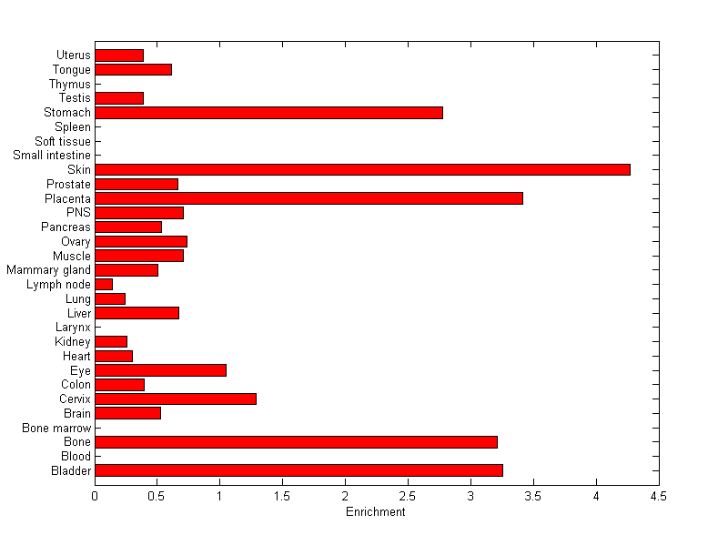 The expression level is normalized with tissue-library size. Each value for a gene in a tissue is a ratio of observed ESTs to the expected one in this tissue. The expected number of ESTs is the product of total ESTs of the gene and the fraction of total ESTs in the tissue among all ESTs in 30 tissues.