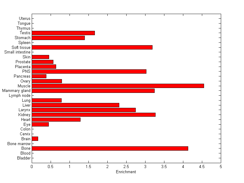 The expression level is normalized with tissue-library size. Each value for a gene in a tissue is a ratio of observed ESTs to the expected one in this tissue. The expected number of ESTs is the product of total ESTs of the gene and the fraction of total ESTs in the tissue among all ESTs in 30 tissues.