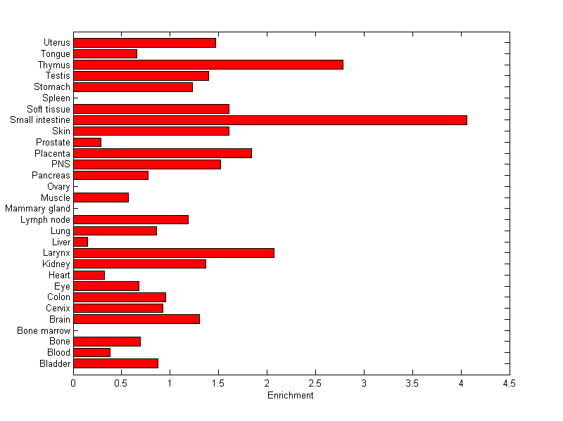 The expression level is normalized with tissue-library size. Each value for a gene in a tissue is a ratio of observed ESTs to the expected one in this tissue. The expected number of ESTs is the product of total ESTs of the gene and the fraction of total ESTs in the tissue among all ESTs in 30 tissues.