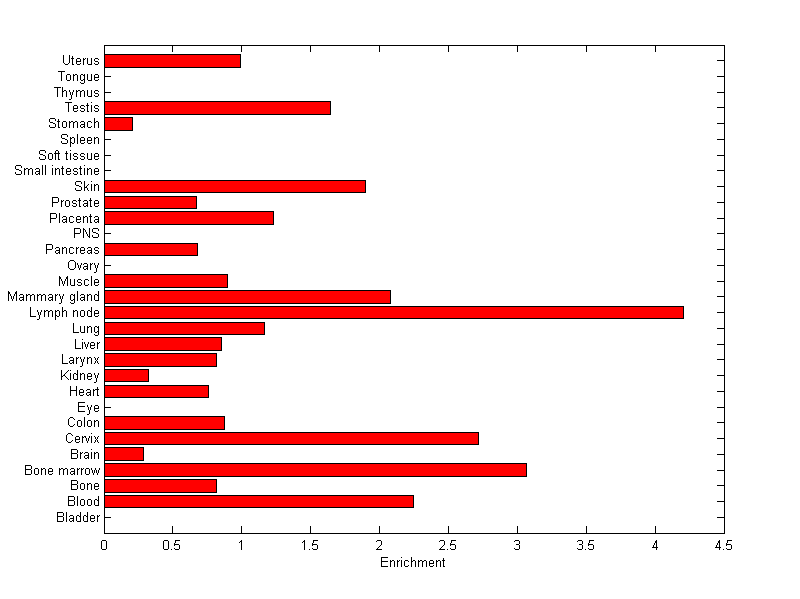 The expression level is normalized with tissue-library size. Each value for a gene in a tissue is a ratio of observed ESTs to the expected one in this tissue. The expected number of ESTs is the product of total ESTs of the gene and the fraction of total ESTs in the tissue among all ESTs in 30 tissues.