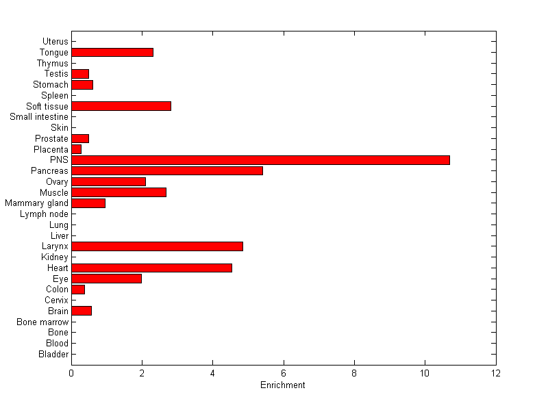 The expression level is normalized with tissue-library size. Each value for a gene in a tissue is a ratio of observed ESTs to the expected one in this tissue. The expected number of ESTs is the product of total ESTs of the gene and the fraction of total ESTs in the tissue among all ESTs in 30 tissues.