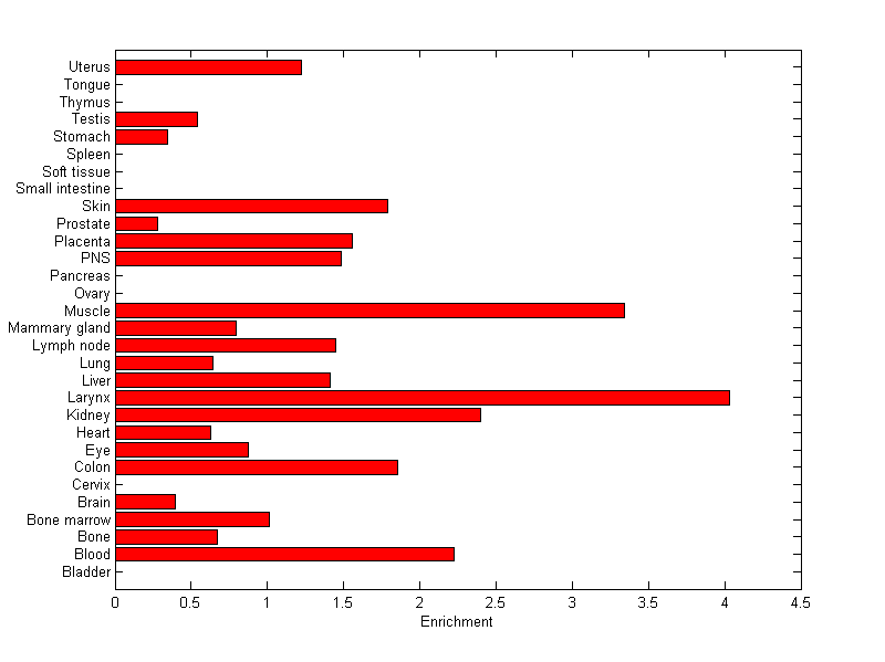 The expression level is normalized with tissue-library size. Each value for a gene in a tissue is a ratio of observed ESTs to the expected one in this tissue. The expected number of ESTs is the product of total ESTs of the gene and the fraction of total ESTs in the tissue among all ESTs in 30 tissues.