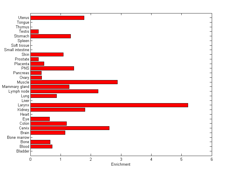 The expression level is normalized with tissue-library size. Each value for a gene in a tissue is a ratio of observed ESTs to the expected one in this tissue. The expected number of ESTs is the product of total ESTs of the gene and the fraction of total ESTs in the tissue among all ESTs in 30 tissues.