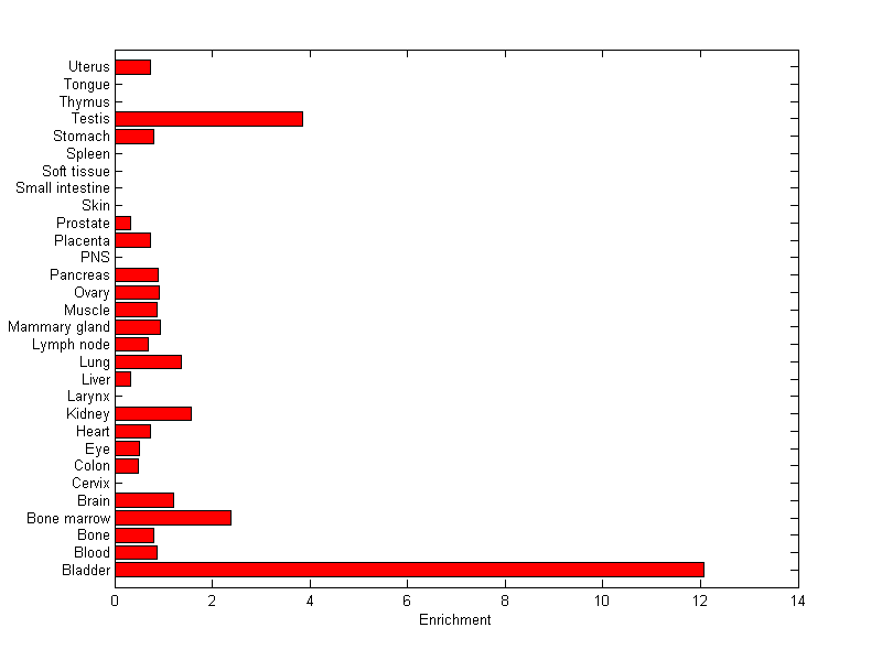 The expression level is normalized with tissue-library size. Each value for a gene in a tissue is a ratio of observed ESTs to the expected one in this tissue. The expected number of ESTs is the product of total ESTs of the gene and the fraction of total ESTs in the tissue among all ESTs in 30 tissues.