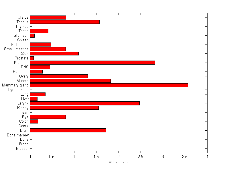 The expression level is normalized with tissue-library size. Each value for a gene in a tissue is a ratio of observed ESTs to the expected one in this tissue. The expected number of ESTs is the product of total ESTs of the gene and the fraction of total ESTs in the tissue among all ESTs in 30 tissues.
