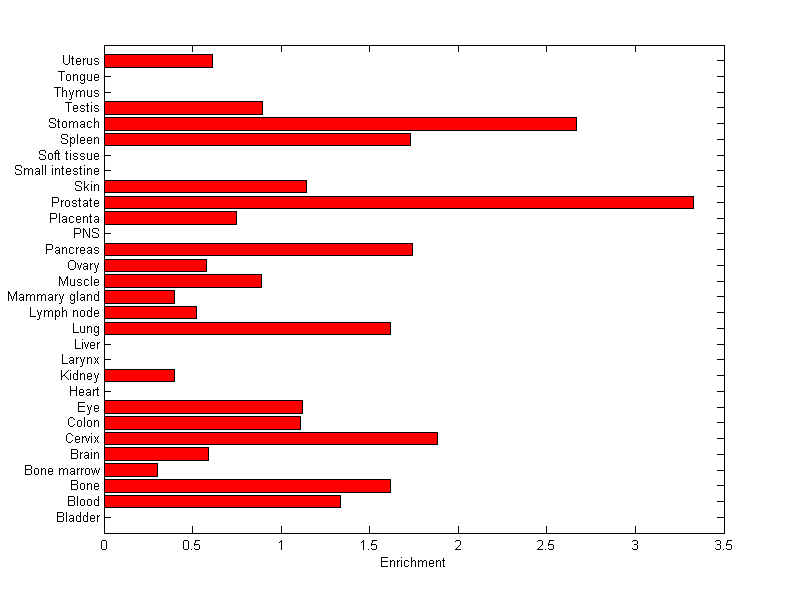 The expression level is normalized with tissue-library size. Each value for a gene in a tissue is a ratio of observed ESTs to the expected one in this tissue. The expected number of ESTs is the product of total ESTs of the gene and the fraction of total ESTs in the tissue among all ESTs in 30 tissues.