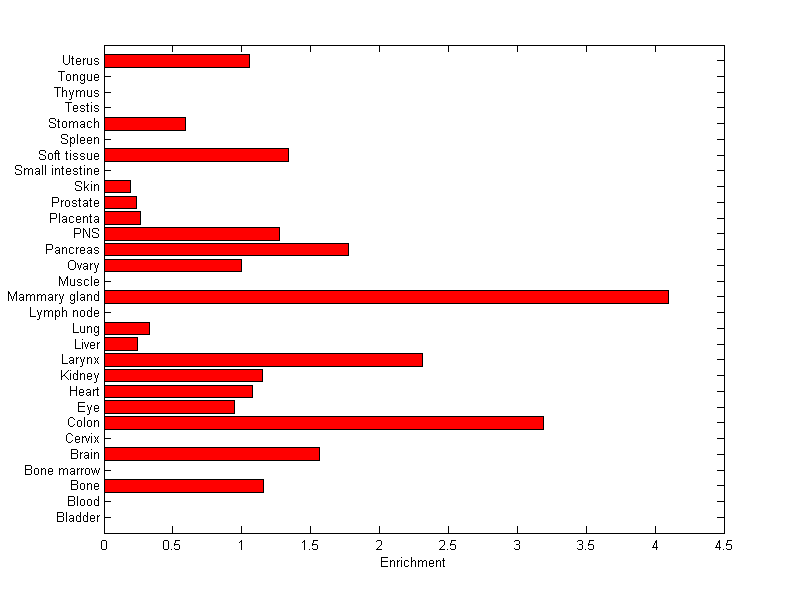 The expression level is normalized with tissue-library size. Each value for a gene in a tissue is a ratio of observed ESTs to the expected one in this tissue. The expected number of ESTs is the product of total ESTs of the gene and the fraction of total ESTs in the tissue among all ESTs in 30 tissues.
