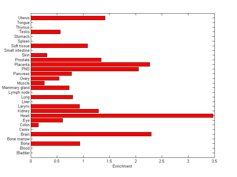 The expression level is normalized with tissue-library size. Each value for a gene in a tissue is a ratio of observed ESTs to the expected one in this tissue. The expected number of ESTs is the product of total ESTs of the gene and the fraction of total ESTs in the tissue among all ESTs in 30 tissues.