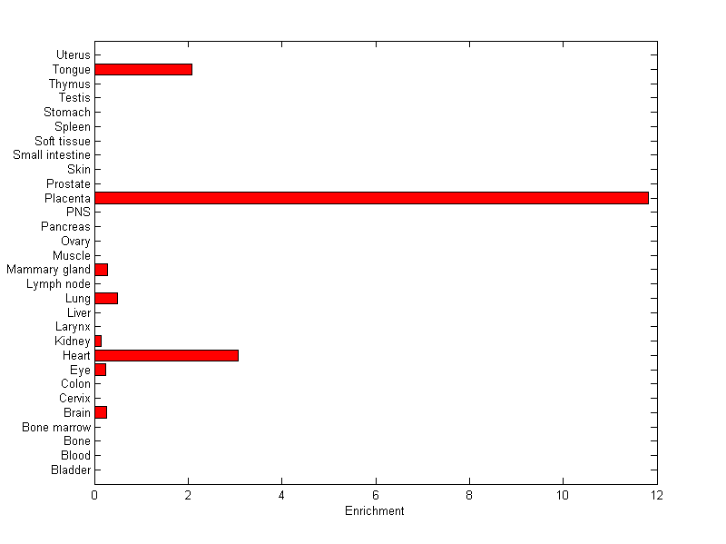 About the profile: The expression level is normalized with tissue-library size. Each value for a gene in a tissue is a ratio of observed ESTs to the expected one in this tissue. The expected number of ESTs is the product of total ESTs of the gene and the fraction of total ESTs in the tissue among all ESTs in 30 tissues. Summary: This gene is preferentially expressed in [placenta] Download: |
