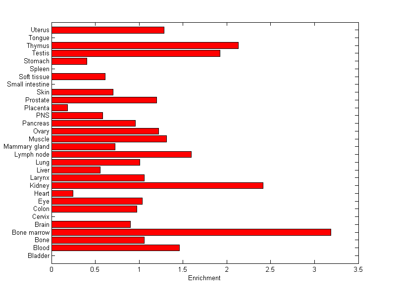 The expression level is normalized with tissue-library size. Each value for a gene in a tissue is a ratio of observed ESTs to the expected one in this tissue. The expected number of ESTs is the product of total ESTs of the gene and the fraction of total ESTs in the tissue among all ESTs in 30 tissues.
