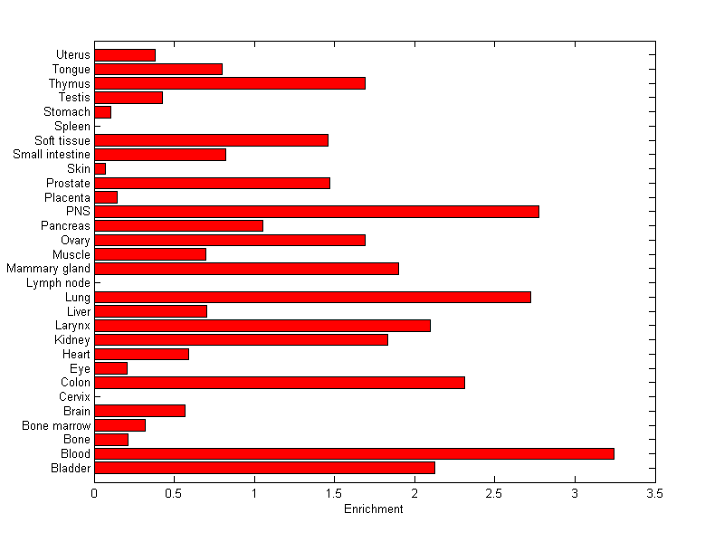 The expression level is normalized with tissue-library size. Each value for a gene in a tissue is a ratio of observed ESTs to the expected one in this tissue. The expected number of ESTs is the product of total ESTs of the gene and the fraction of total ESTs in the tissue among all ESTs in 30 tissues.