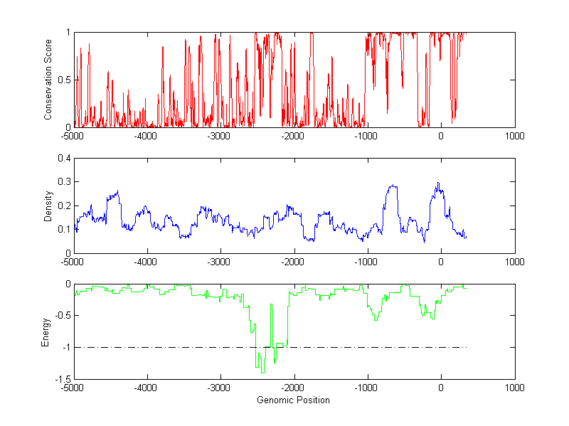 The energy profile (green curve) is about energy for module detection based on TF interaction. The positions with energy less than -1 indicate the existence of CRMs.