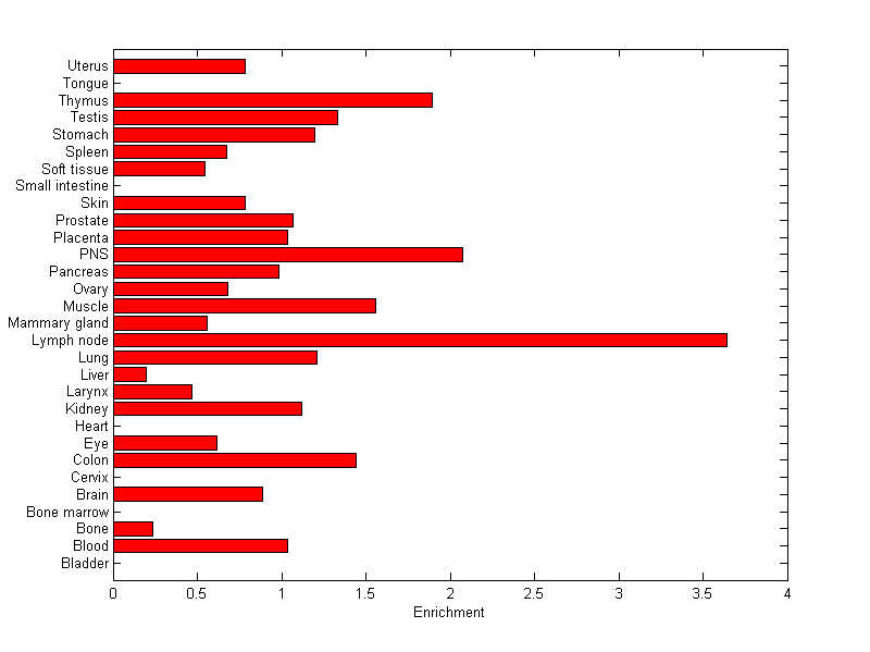The expression level is normalized with tissue-library size. Each value for a gene in a tissue is a ratio of observed ESTs to the expected one in this tissue. The expected number of ESTs is the product of total ESTs of the gene and the fraction of total ESTs in the tissue among all ESTs in 30 tissues.